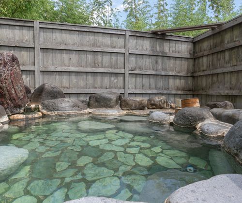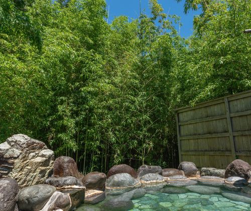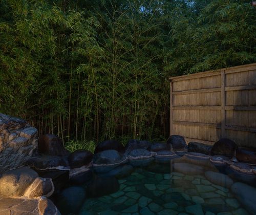 貸切露天風呂「帯解」は、竹林に囲まれた吹き抜けの野趣あふれる佇まいをしていて、カップルやご家族・グループ、水入らずでご利用いただけます。