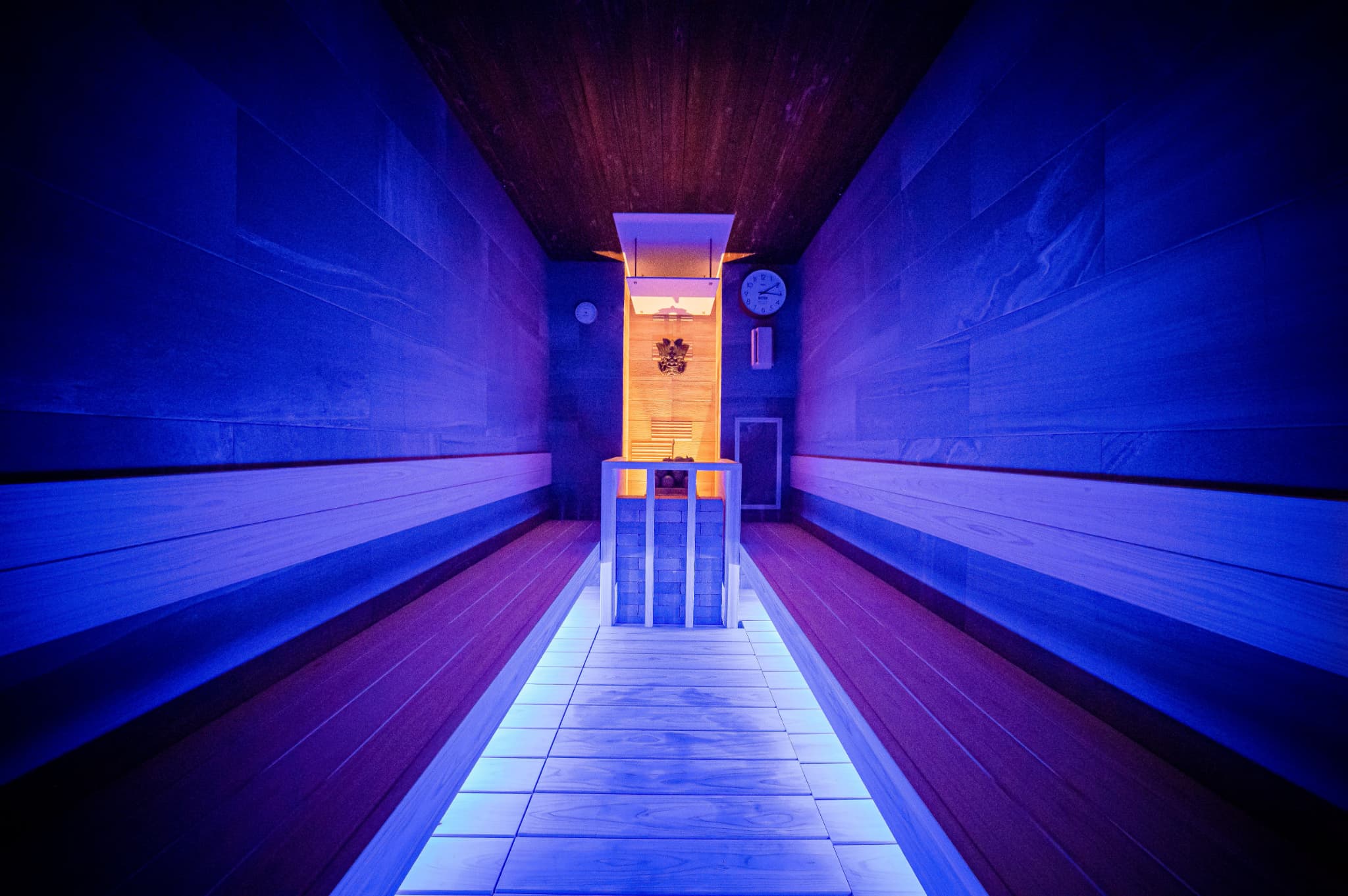 サウナ室は2つの空間に分かれており、赤鬼をテーマにした「炎」はなんと約110℃で、自動ロウリュにより一気に体感温度が上昇。青鬼をテーマにした「蒼」は約90℃で瞑想を思わせる落ち着いた空間です。炎と蒼を行き来することで、心も体も深くととのっていきます。