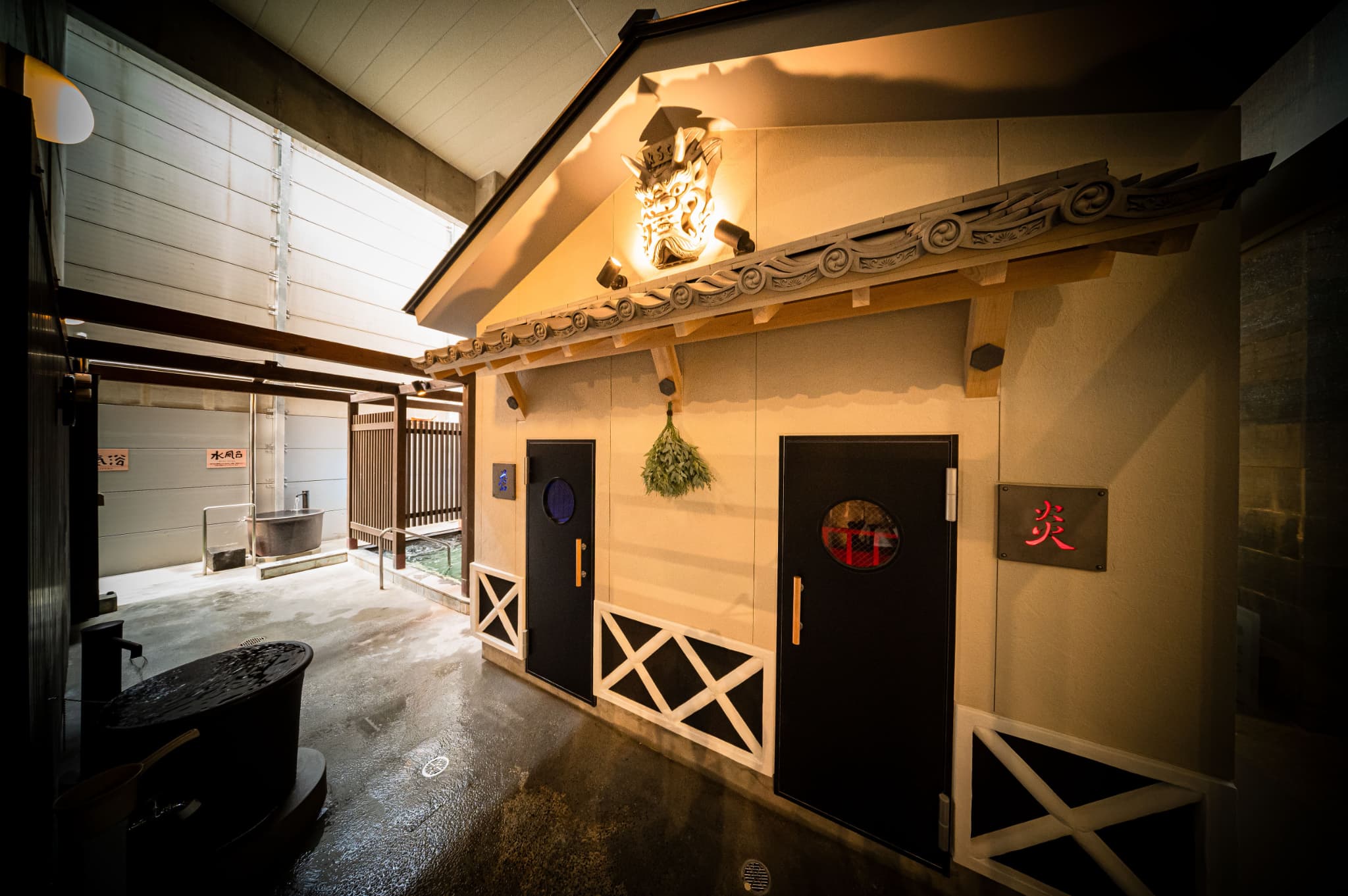 男性エリアでは、「鬼サウナ」に注目しましょう。日本蔵をモチーフにした外観と、愛媛の鬼瓦や瓦サウナストーンが印象的です。