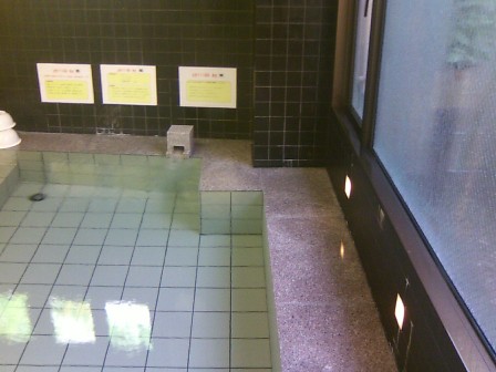 浴室もこじんまりしていまして、男女壁側奥に向かって浅風呂、電気、深風呂、ジェットバイブラの気泡系、酵素風呂に水風呂。外壁側に突き出した形で低~中温のサウナとあります。他に全身シャワーなんかも置いてあります。それぞれの浴槽は1~2人用でして、主浴槽の湯吐きはビードロを逆さにしたような形をしています。京都では時々みかけますね。明るくてきれいな印象の浴室ですが、塩素臭がやや強いのが玉に瑕かと。