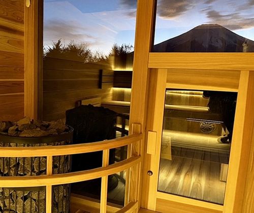 前面ガラス張りのサウナからは、四季折々の雄大な富士の景色や、刻一刻と変わる雲の流れや満天の星々など二度と同じ景色は無い無限の自然の共生を楽しむことができ、至高の体験を提供します。