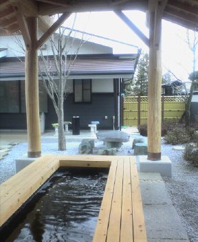 男女が入替わり制で、前回とは違うお風呂でした。ずいぶん違うレイアウト。前回入ったのは内湯が四角い湯槽がひとつで、露天は横に長い岩風呂。シンプルな造りで広々した印象でした。今回入った方は出入り口が2ヶ所あり、全体はロの字型で巡回式。浴室全体が完全なシンメトリーになっています。洗い場が狭苦しく、露天も二つの湯槽に分けている分狭い。屋根と塀に囲まれていて閉塞感があり、露天というより風通しのいい内湯みたいな感じ。屋根には窓があってそこから空が窺えるけど。ちょっと狙いがわかりづらい造りです。(帰ってから調べたら、こっちのお風呂が以前からあったもので、男女に仕切られていたそうです。10年ほど前のリニューアルで新しい浴室ができて、その際男女の仕切りを取ってひとつの浴室にしたそうです。納得。)