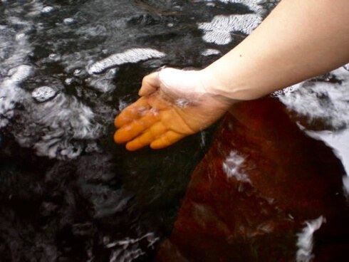 東京や神奈川によく見られる黒湯というタイプの温泉で、泉質はナトリウム塩化物炭酸水素塩温泉。弱アルカリ性低張性温泉でpH値は7.98。お湯が勢いよく出てくる付近にいると、体に無数の気泡が付着するのがわかります。
