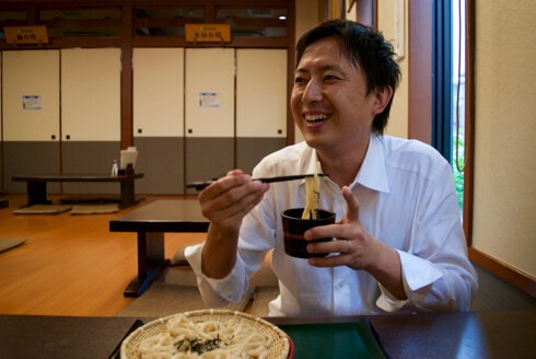 ごちそう屋の嘉祥寺さんにも無理やり健康玄うどんを食べてもらいました。いい笑顔だよ~