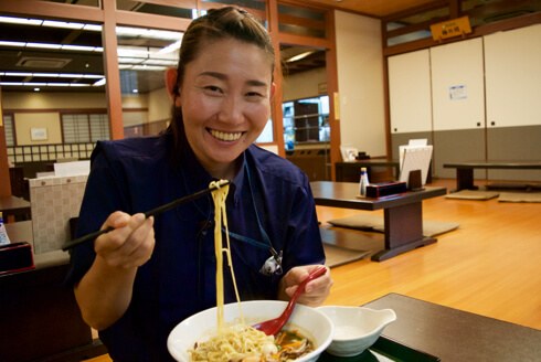 取材の対応や撮影のお手伝いまでしていただいた小嶋さんに、ちゃっかり広東麺を試食するモデルも依頼。ちょっと照れながらもしっかり笑顔!