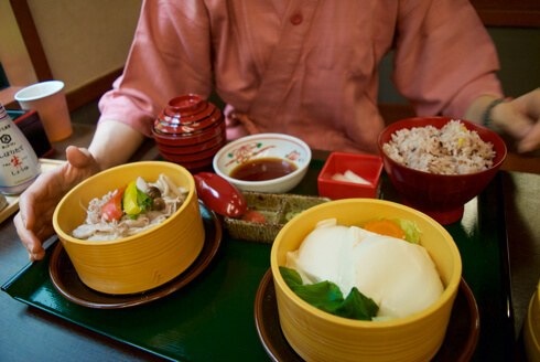 まずは、四元豚、パプリカ、水菜、レタスなどの季節の野菜、自家製豆腐のせいろ蒸し、十六穀米、味噌汁、季節のお漬物がセットになった「四元豚のせいろ蒸し膳」から。