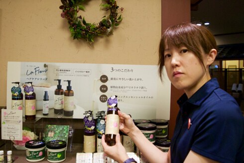 浴室に置いてあるラ・フルールのヘアケアシリーズも購入可能です。シャンプーはノンシリコンだそう。いいね!