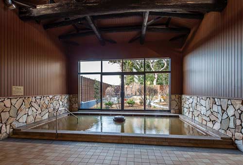 地下約1500mから湧き上がる生源泉を加温・加水をしないでそのまま流し込んだ湯釜です。大きな窓からは約80年にもなる屋敷林が見渡せ、高い天上には梁がめぐり、山間の温泉地を思わせる空間をお楽しみ頂けます。