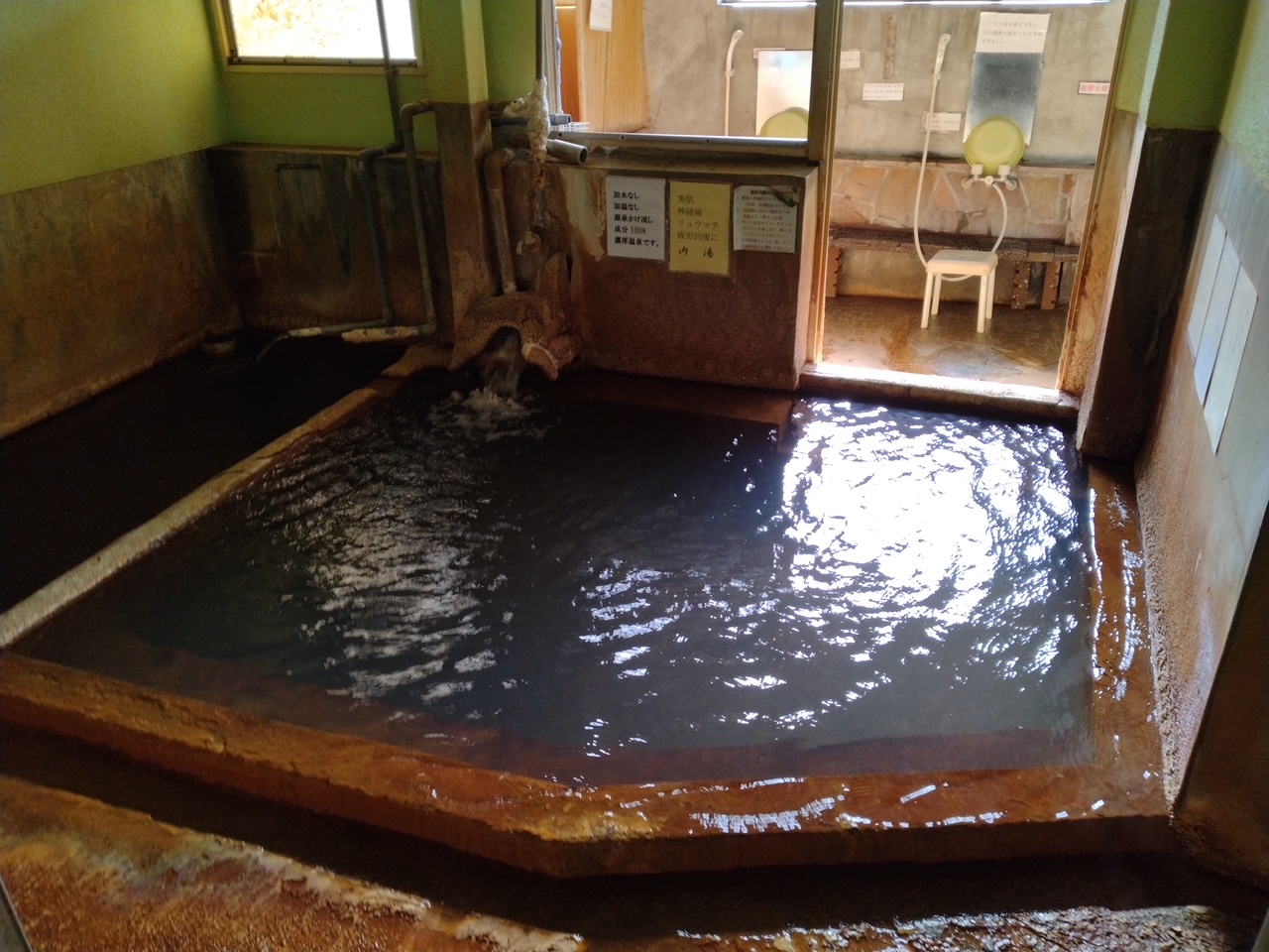 パイプの湯口の湯を口に含むと、ほんのりと鉄臭がして旨じょっぱい味。赤茶色の小さな湯の花も沢山舞っています。