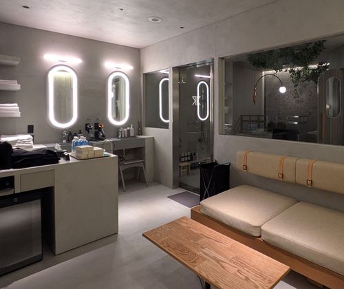 サウナ室はグリーンのライティングが灰暗い部屋に映しく映え、非日常空間で枚ワールドに没頭できます。