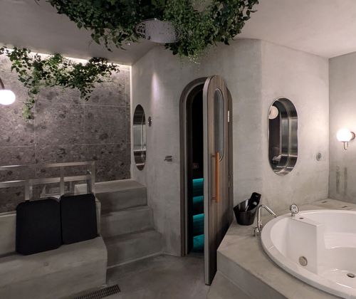 グレーを基調とした部屋となっており、天然温泉ジャグジー、チラーを介した深さ80センチの水風呂、冷水オーバーヘッドシャワーをご用意。
