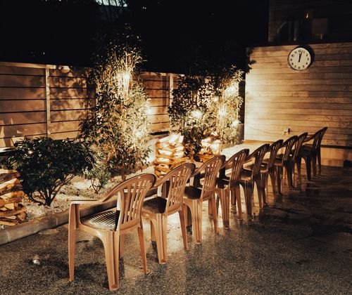 ととのい小屋は、天候に左右されず、室内で心ゆくまでリラックスできます。ドリンクのご用意や夜は幻想的な照明で空間をお楽しみいただけます。 また、軽食やドリンクを楽しめるテラスエリアをご用意。お着替えの手間なしに屋外で飲食をお楽しみいただけます!