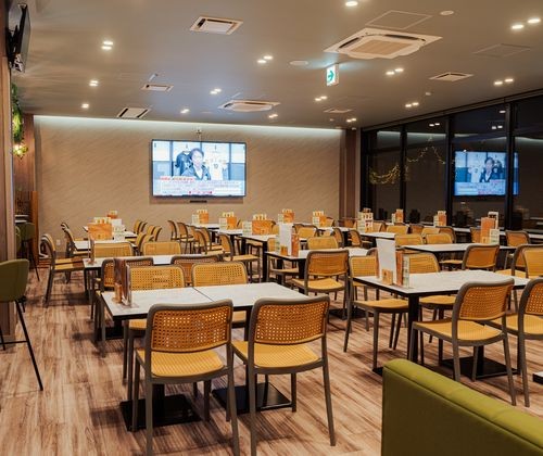 休憩エリアにもスポーツ中継などを映す大型モニター。サッカーや野球の試合を見ながらみんなで盛り上がれるようにと設置されています。