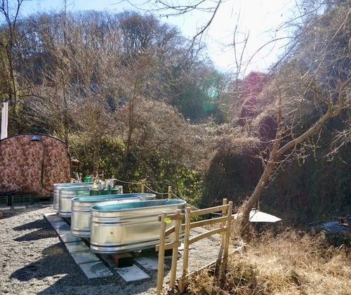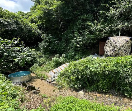 緑の中で自然界の炎と水を惜しみなく使って究極に「ととのう」ことができるアウトドアサウナ。上流に位置する施設内の地下水(飲用検査済)を利用した「天然軟水風呂」もお一人様一個贅沢に利用可能です。