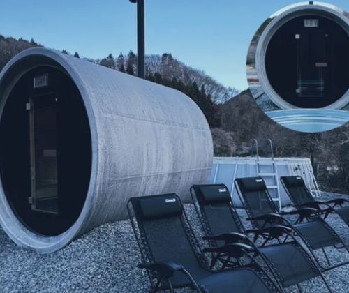 気密性の高いコンクリートの土管をそのままサウナにした、セルフロウリュを楽しむセッティングのサウナです。