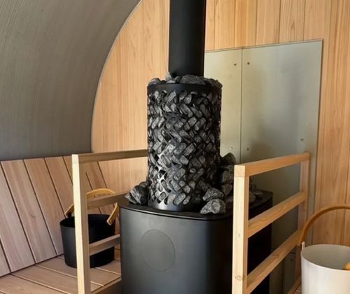 国産ヒノキ材が香るサウナ室内には、サウナストーンに水をかけてもへこたれず長く快適にロウリュができる大型の薪ストーブを採用。ロウリュ用のアロマ水・ハーブ水を2種類、水風呂もサイズが違う2種類が用意されています。
