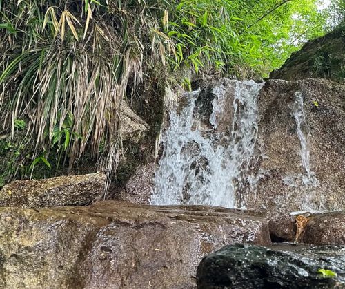 サウナエリアを出てすぐ目の前にある石階段を降りると、高さ120cm程度の渓流の打たせ水があり、この下に座って頭から水を浴びることができます。クールダウンしたあとは、目の前に用意されたチェアでゆったりと休憩が可能です。