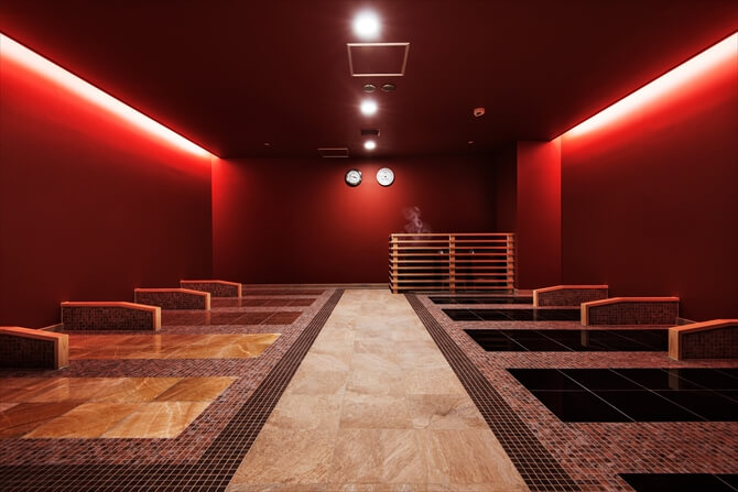 こちらは男女共用の一室「Komorebi」。都内では珍しい二段式岩盤浴が採用されています。