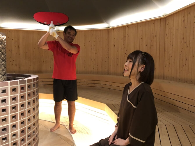 通常は外のテラスで「青空ヨガ」として開催されているそうですが、暑い時期や雨の日は岩盤浴コーナーで行われているとのこと。まもなく始まるとのことなので「このチャンスを逃すまい」と、早速体験してみました!