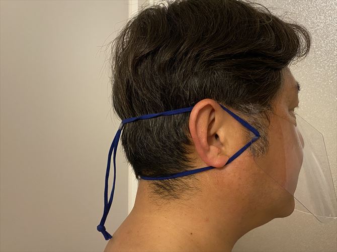 横から見るとこんな感じ。ソフトで伸縮性のある紐が2カ所で押さえてくれるうえに、ビニール素材のシートが頬に密着するので、ピッタリとした装着感があります。