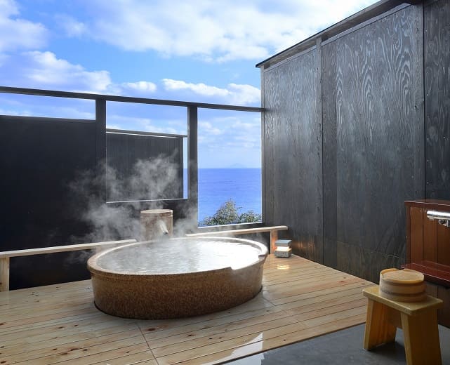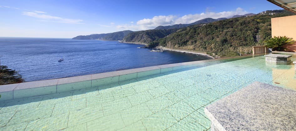 宇佐美湾を一望する絶景露天風呂。趣の異なる5つの温泉を堪能できます。オーシャンビューで露天風呂と絶景を満喫しましょう。