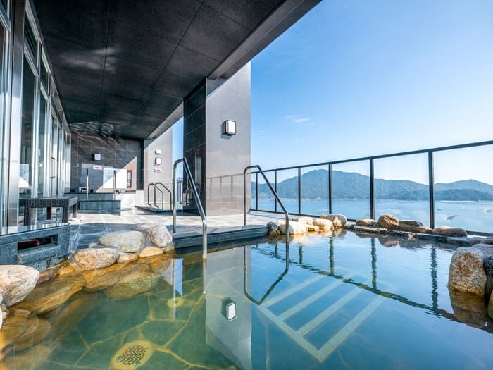 開放感ある広々とした温泉浴場で心も身体もリフレッシュでき、日本三景・宮島や大野瀬戸の絶景を堪能できる露天風呂は3種類。展望露天寝湯風呂は正面に宮島を望む「寝湯」露天風呂です。展望露天岩風呂は夕方はサンセット、夜には「瀬戸内工業地帯」の夜景が楽しめ、展望露天炭酸泉風呂もありますよ。