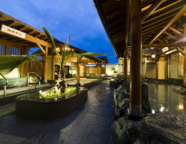 地中海の空をテーマにした「神々のエーゲ海」や、「ワイン風呂」「本格コーヒー風呂」「緑茶風呂」などコンセプトにもとづいた種類が豊富な温泉のアミューズメントパーク。
