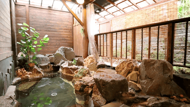 旅館いづもやは、石畳の道を上った高台に位置する家族経営の宿です。2年の歳月をかけて造られた竹細工の露天風呂が特徴で、内湯とともに貸切で利用できます。源泉は100%かけ流しの単純泉。夜間はライトアップされ、幻想的な雰囲気を演出します。温泉は宿泊者限定で提供。静かでゆったりとした時間を過ごしたいカップルや、アットホームな雰囲気を求める方におすすめです。