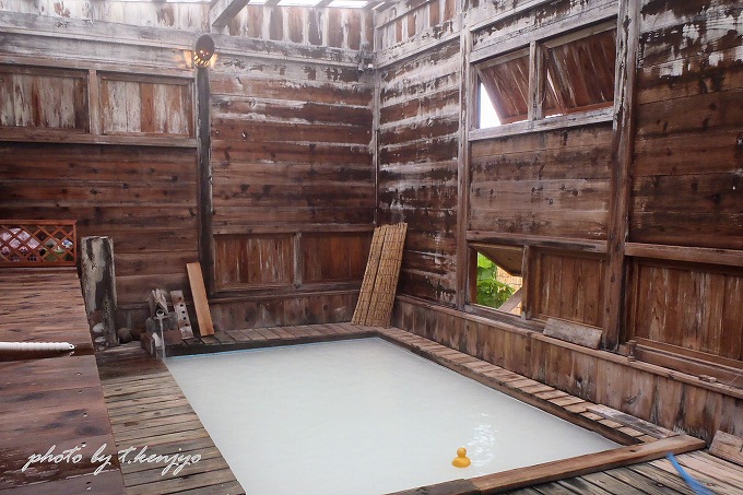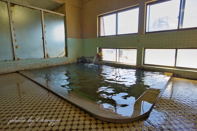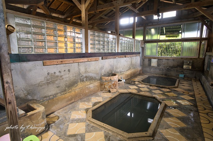 浴室は混浴と女湯の内湯の2箇所。特筆すべきは、混浴内湯が湯船の底から直に温泉が湧く足元湧出温泉である点。時折ぬるめのお湯が湯船の底からプクリと湧き上がってきます。泉質は「単純温泉」ですが、ほんのり金気とアブラ臭(石油の様な香り)を感知。これが不思議と心安らぐ香りで、浴室風情と相まって至福の湯浴みを満喫できます。