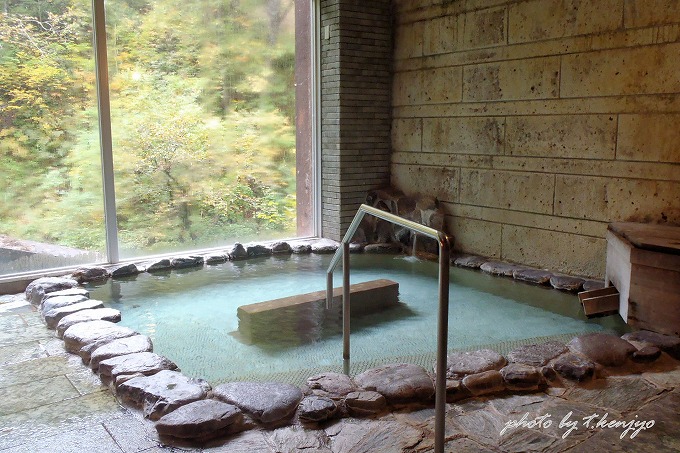 泉質名は「単純硫黄温泉」。白い湯の花舞う自家源泉を所有しています。豪快にかけ流される内湯も良いですが、露天風呂では深い渓谷を眼前に臨みながら湯浴みを楽しめます。