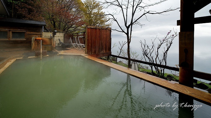 霧に包まれた支笏湖を臨む展望露天風呂
