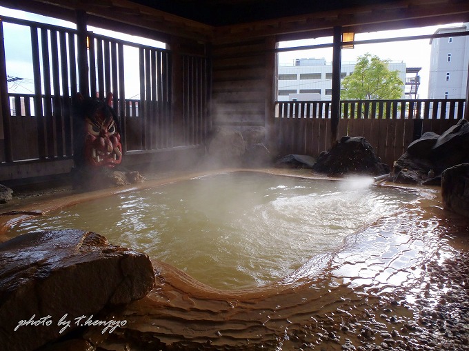 泉質名は「ナトリウム・カルシウム-塩化物・炭酸水素塩・硫酸塩温泉」。しかし浴室ごとに使用源泉が異なり、足元湧出温泉は無色透明で、大浴場では緑~茶褐色のにごり湯です。食塩と重曹成分を程良く含有した泉質で、サッパリと汗を流せる良泉です。