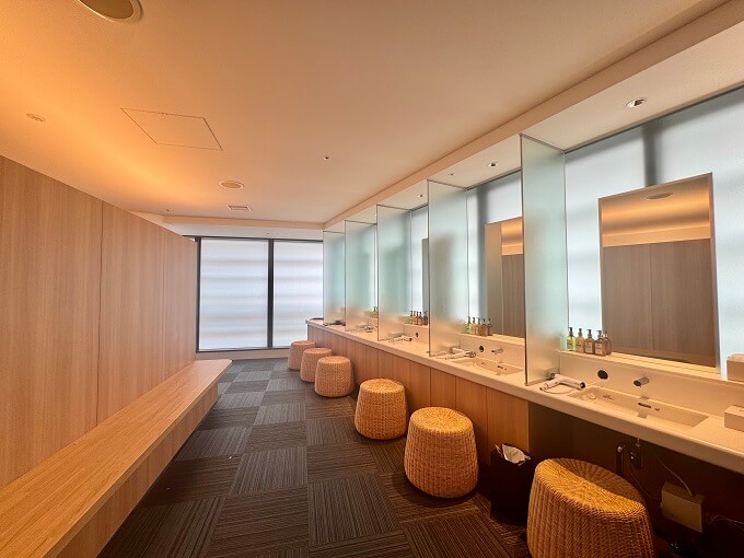 サウナ用オールインワンジェル「NELJAS After Sauna(ネルジャス アフター サウナ)」の主な使用タイミングは、サウナ後。『スパ&サウナ コリドーの湯』のパウダールームは清潔感にあふれ、ゆったりとスキンケアやボディケアを行える空間でした。