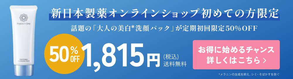ただいまパーフェクトワンでは、オンラインショップ初めての方限定で最新作「薬用ホワイトニングクレンジングパック」の現品を定期初回半額で始められるキャンペーンを実施中!