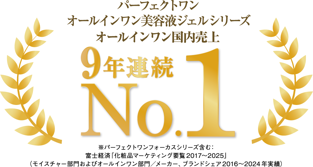 *1 パーフェクトワンフォーカスシリーズ含む:富士経済「化粧品マーケティング要覧2017~2025」(モイスチャー部門およびオールインワン部門/メーカー、ブランドシェア2016~2024年実績)*2 TFCO株式会社調べ「最大の顔用保湿ジェルブランド」(パーフェクトワン オールインワン美容液ジェルシリーズ 2023年1月~12月販売実績)