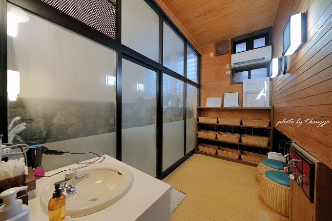 脱衣室には、洗面台・ドライヤー・ハンドソープなどの備品・アメニティグッズが設置。鍵付きの小型貴重品入れも有るので、ルームキーなどはそちらに入れましょう。