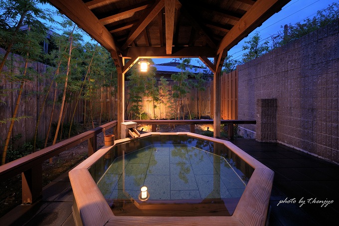 貸切露天風呂「槇の湯」。ブルーアワーの夜空とよくマッチした浴室です。