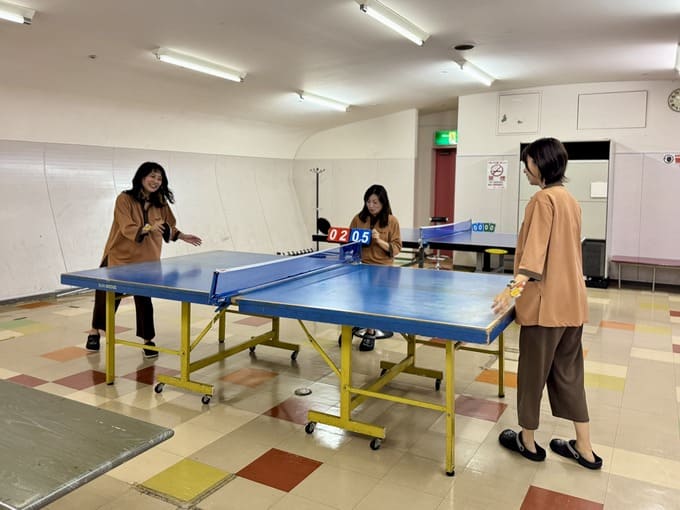 徒歩で数分移動すると、館内着のまま利用OKなボウリング場や卓球場に到着。シミュレーションゴルフ施設もあり、みんなでワイワイ。童心に帰って遊ぶ時間を過ごしました。