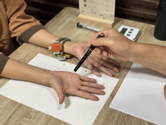 『仕事と子育ての両立について悩んでいるが、どうしたらよいか』を相談しました。今回占ってくれた先生は、ベテランの占い師の方。その雰囲気から、“この人に占ってもらえるのが楽しみ!”と思いました。まずはじめに手相を見てくれて、その後で、生年月日と生まれた時刻から占う四柱推命をやってくれました。