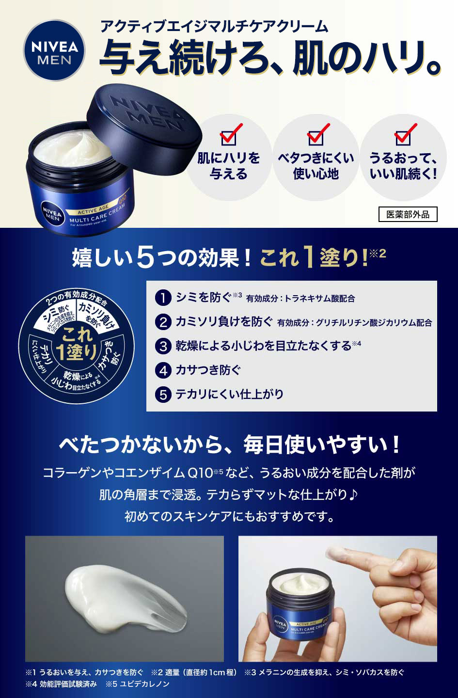 「ニベアメン アクティブエイジマルチケアクリーム」は、肌にうるおいを与え、カサつきを防ぐ先回り予防ケア*2商品。