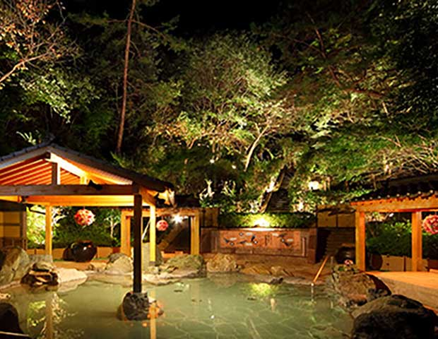 紅葉と竹林をテーマにした神戸最大級を誇る露天風呂の5つの浴槽で、源泉かけ流しの天然温泉や当地に湧く名水「宮水」のお風呂を楽しむことが可能。