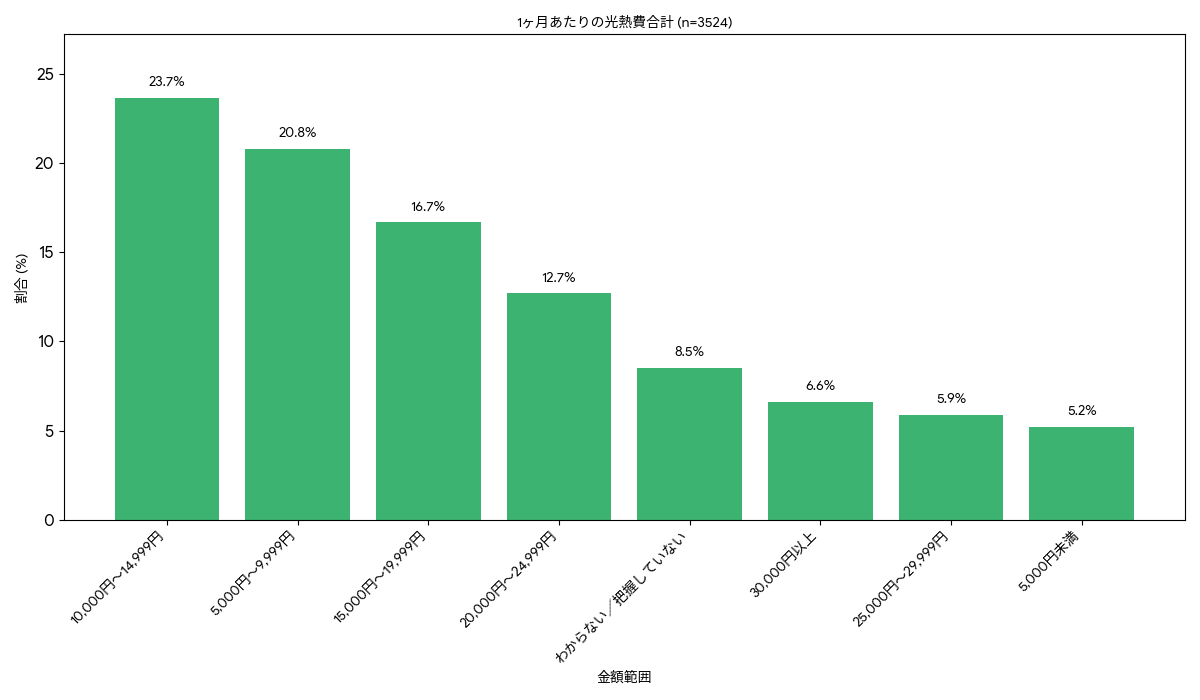 最多は1万〜1万5千円未満(23.7%)。続いて5千〜1万円未満(20.8%)がランクインし、全体の約4割が“月1万円前後”に集中していることが明らかになりました。その一方で、2万円以上という回答も約25%にのぼり、およそ4人に1人が2万円超という結果に。物価やエネルギー価格の高騰を背景に、光熱費の負担を実感している家庭も少なくない様子がうかがえます。