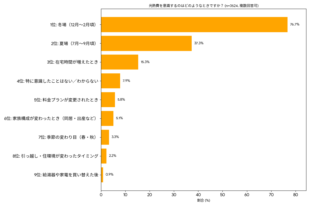 約8割が「冬」と回答。光熱費を意識するタイミングで最も多かったのは、冬場(12月~2月頃)の76.7%。実に4人に3人以上が、冬に強く意識していることがわかりました。2位の夏場(37.3%)と比べても、冬は約2倍。暖房の使用増加に加え、給湯や入浴時間が長くなるなど、冬特有の生活習慣が影響していると考えられます。また、「在宅時間が増えたとき(15.3%)」も上位に。テレワークや長期休暇など、家にいる時間の増加がそのままエネルギー使用量の増加につながっている様子がうかがえます。