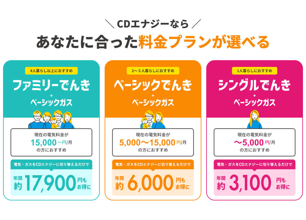 *CDエナジーダイレクトの「シングルでんき」「ベーシックでんきB」「ファミリーでんき」の3プランの中で最も安くなる最適プランをお知らせします。なお、「ずーっと」とは毎年2回、定期的に最適プランをお知らせすることを指します。