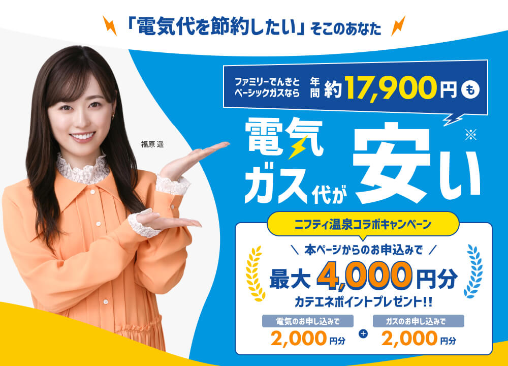 現在、キャンペーンページから電気・ガスをお申込みいただくと、最大4,000円分の「カエテネポイント」をプレゼント中!電気のお申込みで2,000円分、ガスのお申込みでさらに2,000円分と、セットで申し込むほどおトクです。快適なお風呂時間はそのままに、光熱費を見直したい人は必見です。