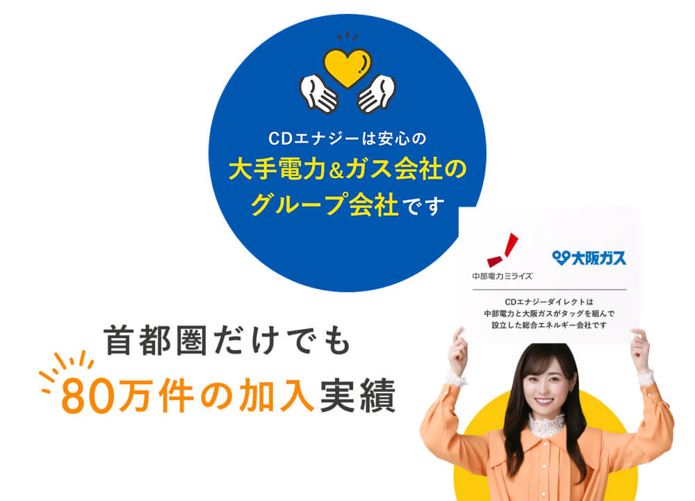 CDエナジーは、「大阪ガス」と「中部電力ミライズ」という大手エネルギー会社2社が共同出資して誕生したエネルギーサービスです。 確かな実績を背景に、首都圏を中心に電気・ガスあわせて80万件*以上の契約を獲得。