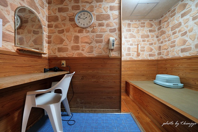 脱衣室には、テーブル・椅子・畳スペース・エアコン・ドライヤー(無料)が設置。必要最低限の設備は整っています。