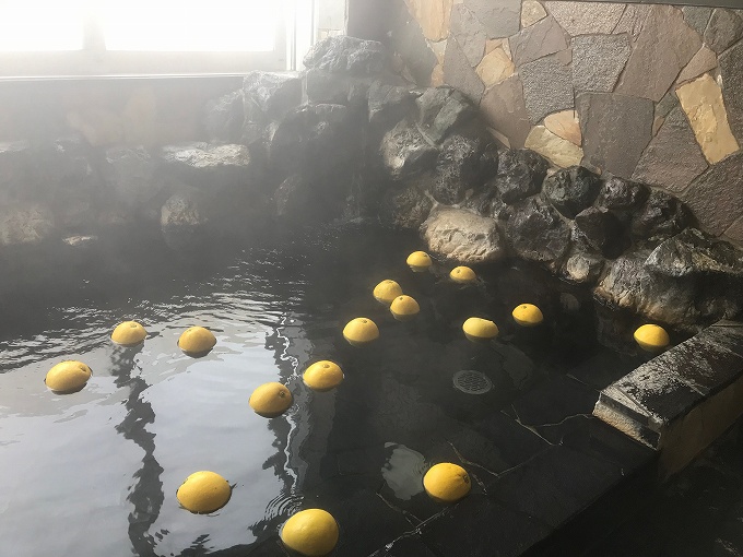桜湯。風呂の日(2月6日)は特別にぼんたん湯を楽しめます。