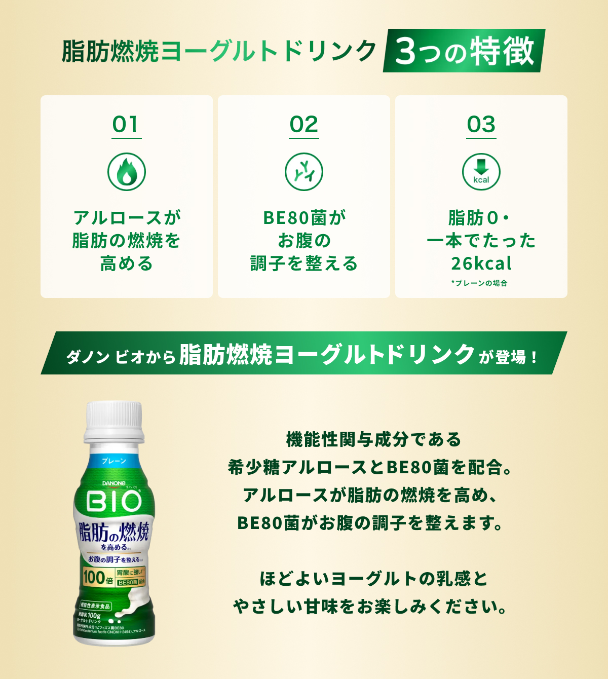 カロリーも控えめで手軽に始められる「ダノン ビオ 脂肪燃焼ヨーグルトドリンク」をぜひお試しください。