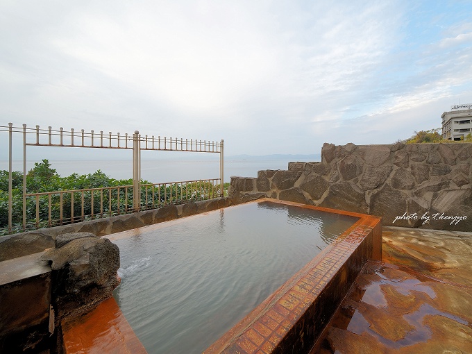 露天風呂では、やや小ぶりな浴槽ながらも錦江湾を臨みながら入浴を楽しめます。どうしても混浴に抵抗がある方にはむしろおすすめ。内湯と露天風呂を交代浴できる点も魅力的です。